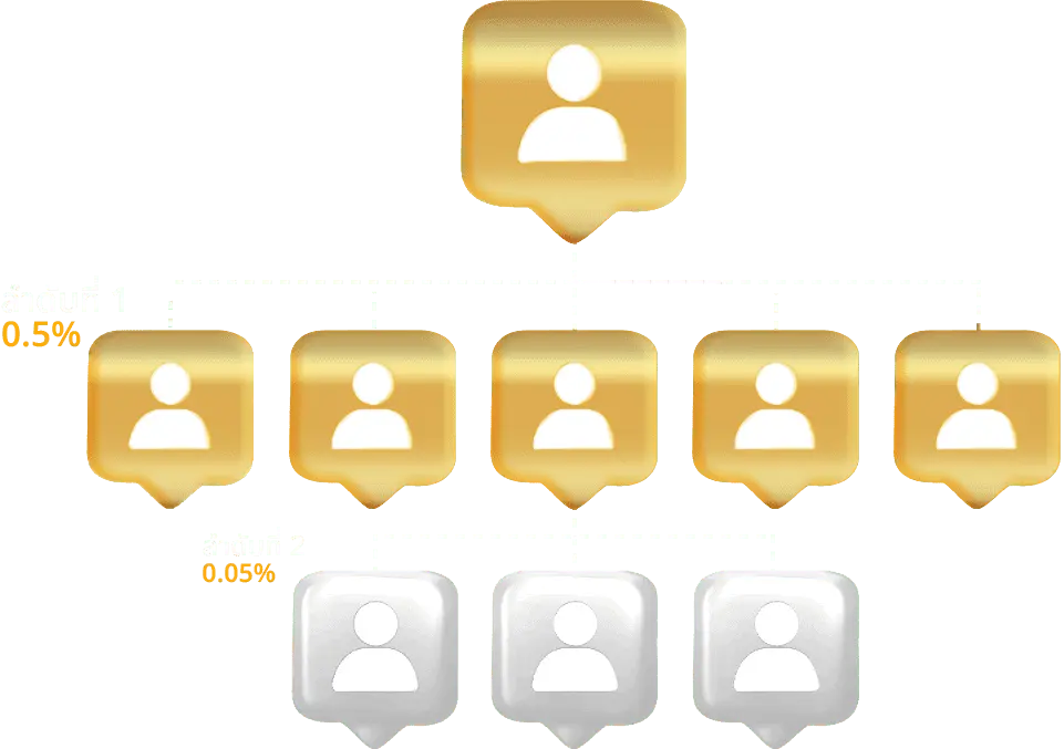 - เครือข่ายขั้นที่ 2 รับส่วนแบ่งจากยอดเล่นของเพื่อนคุณที่วางเดิมพันทุกยอดเล่น 0.05%